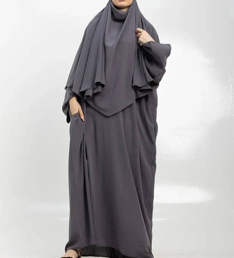 Two piece set which includes a detachable khimar hijab and loose fit abaya with pockets. The regular sleeves are slightly wide enough for making it wudhu friendly.